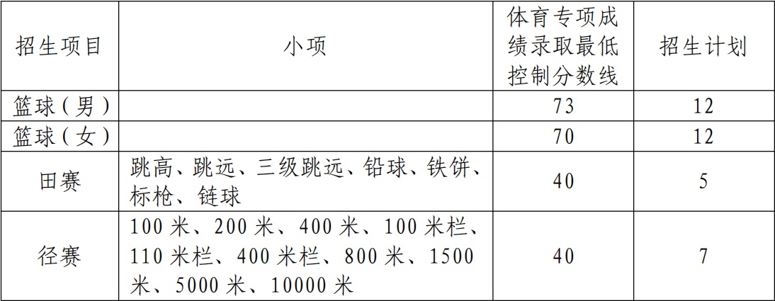 第十七条 根据国家体育总局文件精神,考生文化成绩录取控制分数线不低于180分,体育专项成绩录取控制分数线详见招生计划表。根据考生的文化成绩(折合百分制后)和体育专项成绩按3∶7的比例进行综合评价,计算考生录取综合分。具体公式为:综合分=(文化成绩/6)×30%+体育专项成绩×70%。综合分计算时保留小数点后两位,采用四舍五入计数保留法。