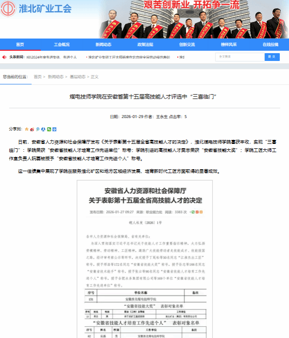 煤电技师学院在安徽省第十五届高技能人才评选中“三喜临门”