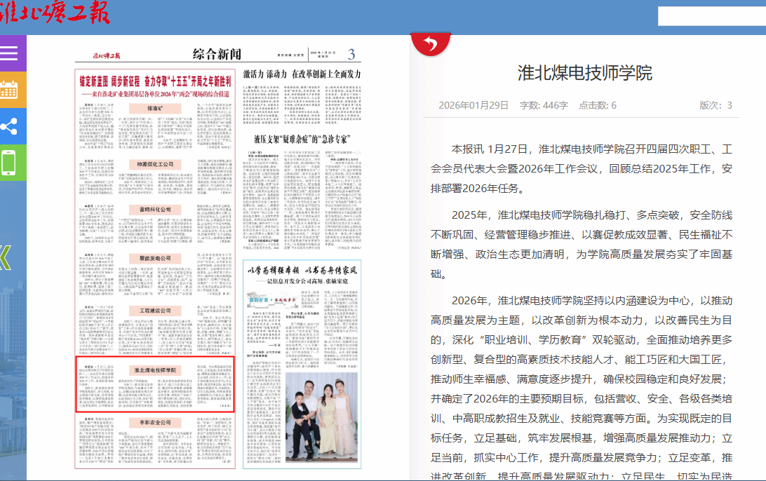 2026年,淮北煤电技师学院坚持以内涵建设为中心,以推动高质量发展为主题,以改革创新为根本动力,以改善民生为目的,深化“职业培训、学历教育”双轮驱动,全面推动培养更多创新型、复合型的高素质技术技能人才、能工巧匠和大国工匠,推动师生幸福感、满意度逐步提升,确保校园稳定和良好发展;并确定了2026年的主要预期目标,包括营收、安全、各级各类培训、中高职成教招生及就业、技能竞赛等方面。