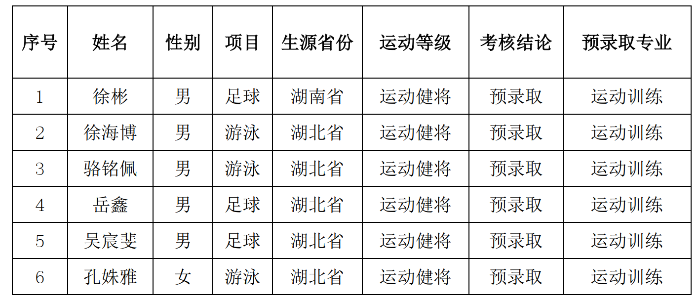 根据《体育总局办公厅关于做好2026年高校保送录取优秀运动员有关事宜的通知》和《华中科技大学2026年保送录取优秀运动员招生简章》,我校于2026年1月28日对申报我校的运动员进行了面试考核,并按面试成绩从高到低依据招生计划确定预录取名单。现将名单予以公示,公示期为2026年2月2日至6日。如有异议请向我校本科生院招生工作办公室或体育学院反映,联系电话:027-87542228、58868731,电子邮箱:zs@hust.edu.cn。