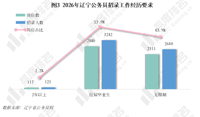 2026年辽宁公务员招录56.1%的岗位对经历有要求,其中要求为应届毕业生的岗位占比达到53.9%;要求有2年以上基层工作经历的岗位全部来自于省直与市直机关。