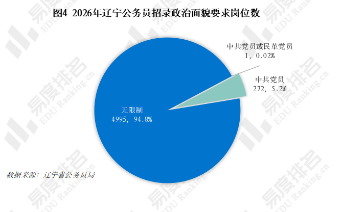 下表展示了2026年辽宁省公务员招录岗位对政治面貌的要求情况。对政治面貌无要求的岗位占比为94.8%,要求中共党员的岗位占比5.2%。