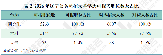 2026年辽宁公务员招录职位学历要求中,专科学历能够报考的职位仅76个,占所有职位的1.4%;而本科学历可报考的职位达到5144个,占所有职位的97.6%。研究生学历则可报考所有职位。