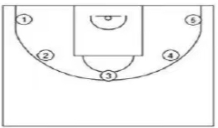 考试方法:以篮圈中心点为圆心,5.5米为半径所画的弧线上设置五个投篮点,每个点位放置5个球,共25个球,需从第一投篮点或者第五投篮点开始投篮,按逆时针或者顺时针依次投完每个点位上的5个球。(每人测试两次取最好成绩)
