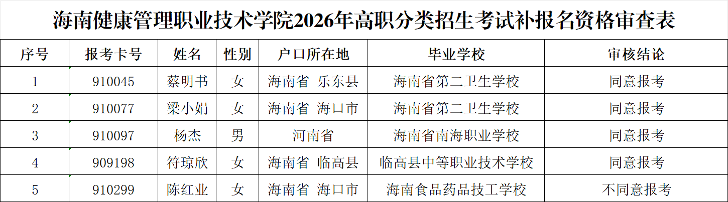 现将我院2026年海南省高职分类招生考试补报名资格审查名单进行公示。