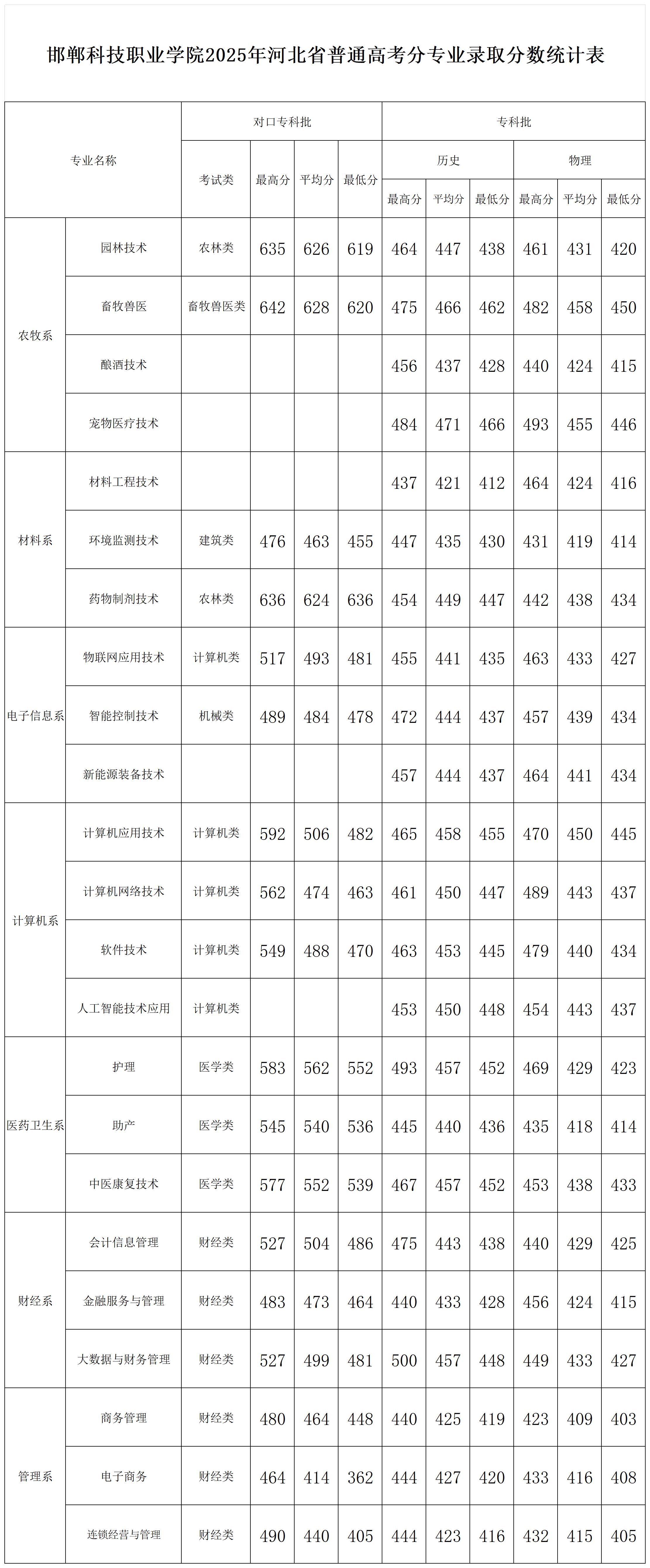 邯郸科技职业学院2025年河北省普通高考分专业录取分数统计表
