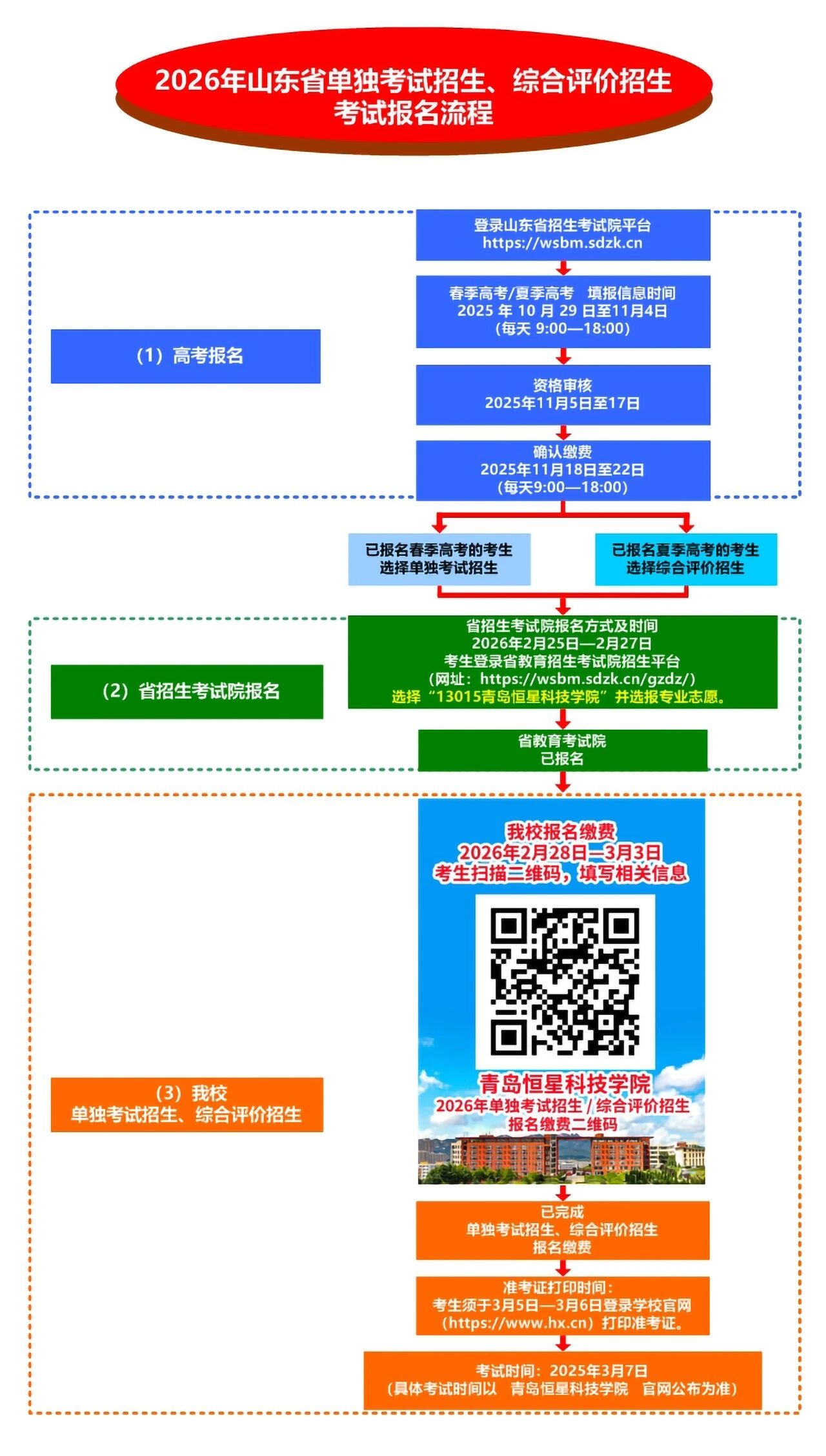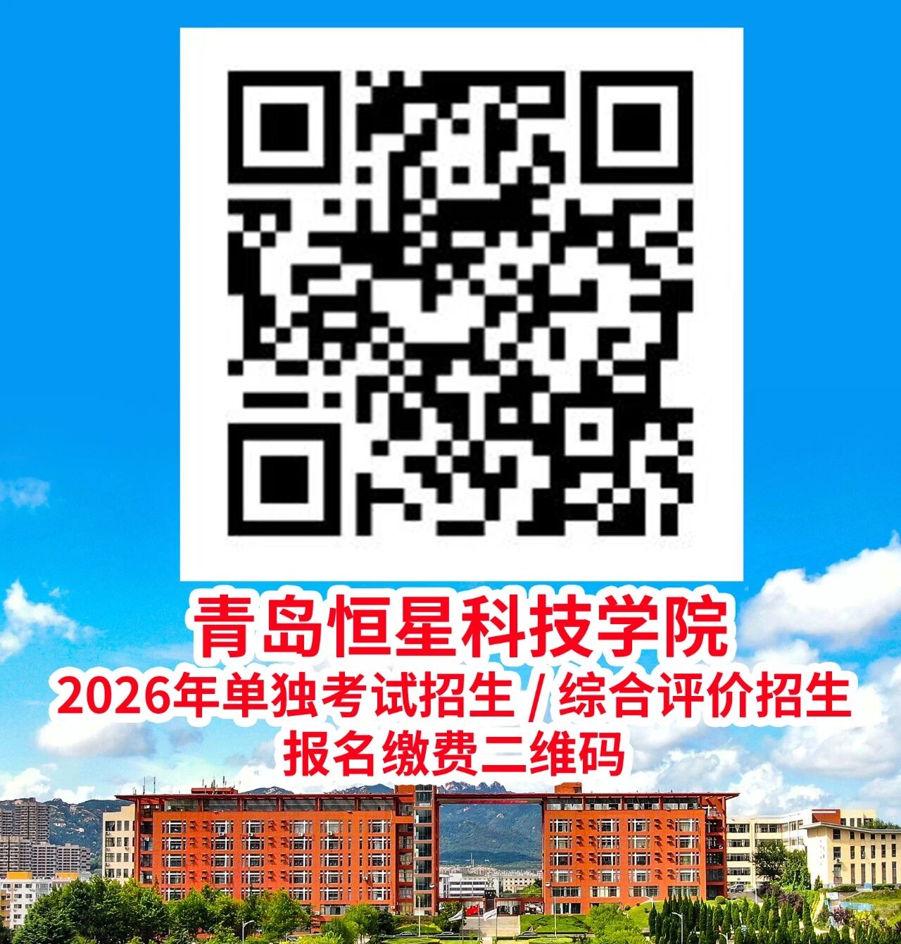 03省招生考试院报名方式及时间:参加单独考试招生和综合评价招生的考生须于2026年2月25日—2月27日,登录省教育招生考试院招生平台(网址:https://wsbm.sdzk.cn/gzdz/)选择“13015青岛恒星科技学院”并选报专业志愿。其中,参加单独考试招生的考生须根据春季高考报考的专业类别选报专业,选报专业对应的专业类别应与本人春季高考报考的专业类别一致。04我校报名方式及时间:参加我校单独考试招生或综合评价招生考试的考生须于2026年2月28日—3月3日,登录学校官网(https://www.hx.cn)或通过微信公众号青岛恒星科技学院招生办(hxkjxyzsb)扫描下方二维码,填写个人信息进行报名缴费。注意事项:扫码报名过程中如需咨询,请联系青岛恒星科技学院招生处0532-86667370。
