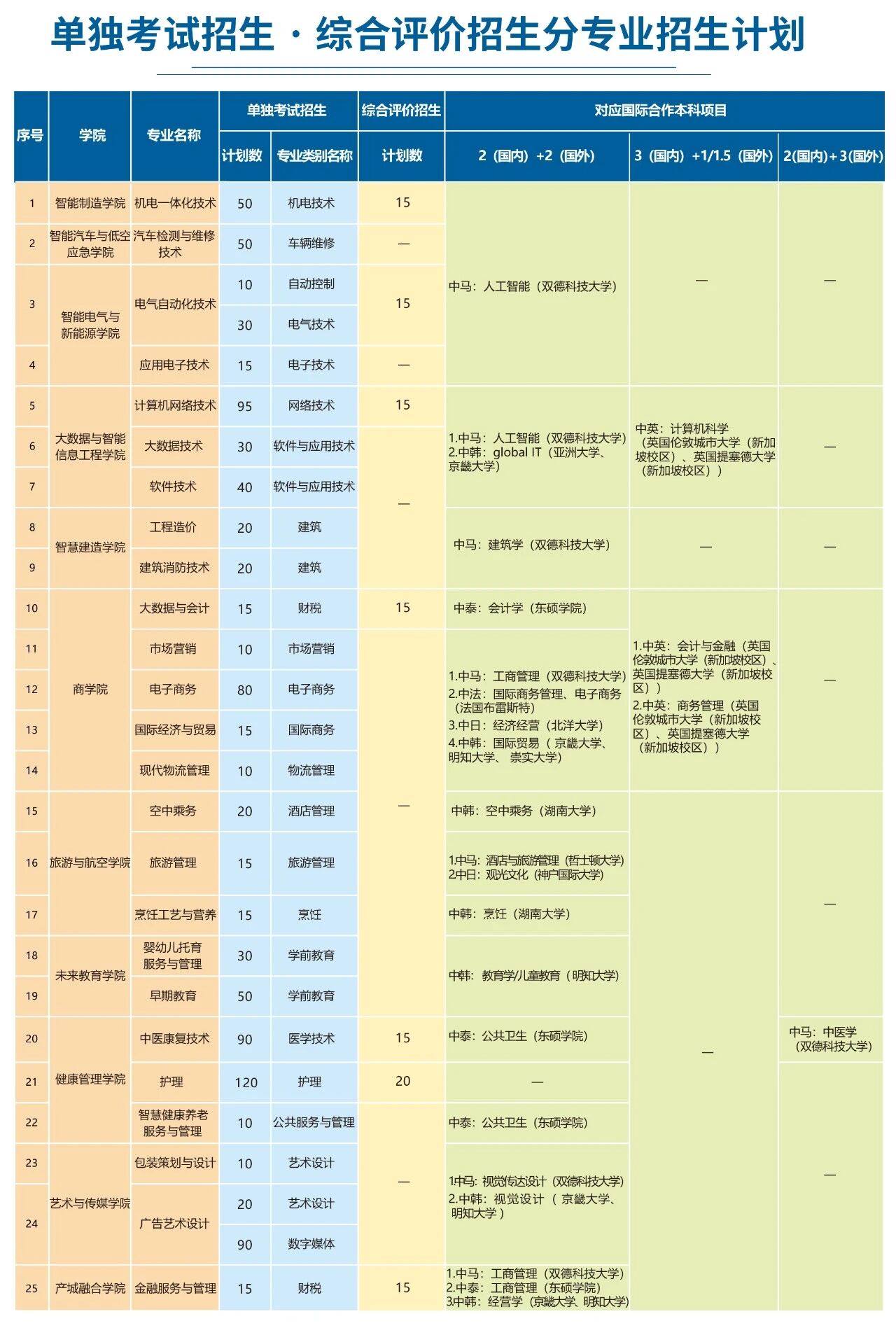 根据《山东省教育厅关于做好 2026 年高职(专科)单独考试招生和综合评价招生工作的通知》,现将青岛恒星科技学院2026年面向山东省开展单独考试招生和综合评价招生工作,有关事项发布如下:01招生专业及计划:2026年我校单独考试招生(普通类)计划:975人,综合评价招生计划:110人,投放招生专业如下。