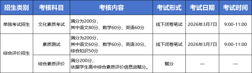 二、考试地点:青岛恒星科技学院(山东省青岛市李沧区九水东路588号),从南门入校。三、来校路线:1.青岛站:乘地铁3号线到李村站下车到附近公交站换乘326、361、112、113、385在“恒星学院”站下车。2.青岛火车北站:青岛火车北站东广场,乘387路到“李家上流小区”站下车;3.长途汽车站:青岛长途汽车站乘326路到“恒星学院”站下车;青岛汽车北站乘605路到李村站转361路到“恒星学院”站下车;青岛沧口长途汽车站北行100米乘112路到“恒星学院”站下车;4.青岛胶东国际机场:乘坐地铁8号线到达青岛北站,换乘387路到“李家上流小区”站下车。四、考生须知1、考生应于3月5日—3月6日8:00-17:00登录我校官网打印准考证,并于考试当天至少提前1小时到达学校南门(青岛市李沧区九水东路588号),由南门入校,抵达A4教学楼,根据楼前张贴的考场分布找到准考证上考场对应的教室位置。考试开考15分钟(即9:15)后禁止入场。2、考生须凭准考证以及有效身份证件原件参加考试,缺一不可(若有效身份证件丢失,则须派出所开具带有照片的户籍证明或临时身份证)。考试答案必须填写在答题纸上(直接在试卷上答题无效),考生须携带2B铅笔、黑色中性笔、2B橡皮等必要文具入场,禁止携带任何书籍、笔记、资料、草稿纸、手机、智能手表以及各种具有信号传输、文本存储等功能的物品。3、考生入场后,根据准考证上座位号对号入座,并将本人的准考证及有效身份证件放在课桌上,以便核验。4、考试中,遇到试卷分发错误或者试题字迹不清等情况,考生请及时举手向监考教师反映(不涉及试题作答的疑问)。考生若无特殊原因,考试结束前不得提前退场。5、考生必须严格遵守考试纪律,服从监考人员安排,否则取消考生考试资格,并按《国家教育考试违规处理办法》处理。考试结束时,考生应立即停止答题,将试卷扣放在桌面上,待监考教师允许后方可离开考场。严禁考生携带试题册、答题卡和草稿纸离开考场。07考试大纲:(1)语文主要考查考生的语言积累与应用能力、阅读理解能力、写作能力等。语言积累与应用:能正确识记常见汉字的音义形;能正确使用常见词语(包括成语),结合语境辨析词语的意义和褒贬色彩;能理解重要词语和句子在文章中的含义和作用,辨析并改正常见语病;能理解与辨析常见的修辞手法;能正确使用标点符号;能理顺段落句子顺序;能识记古今中外重要作家的时代、国别及其代表作;能识记常见的名句名篇。阅读理解:能理解文中重要概念与重要句子的含义;能筛选并整合文中的信息;能分析文章结构,把握文章思路;能分析概括作者在文中的观点态度;能评价文章的思想内容;能鉴赏文学作品的形象、语言和表达技巧。写作能力:掌握记叙文、议论文等类文章的写作技巧并运用娴熟。内容要求:①符合题意。②符合文体要求。③感情真挚,思想健康。④内容充实,中心明确。⑤语言通顺,结构完整。标点正确,不写错别字(2)数学主要考查考生对集合、方程与不等式、函数概念与基本初等函数(指数函数、对数函数、幂函数)、三角函数、数列、向量、圆锥曲线、排列组合、概率与统计初步的理解、掌握与运用情况。(3)英语主要考查考生对英语词汇与语法、日常情景交际、阅读理解的掌握情况。词汇和语法:主要考查考生对基本单词和语法的掌握情况。要求考生从四个备选项中选出一个最佳答案。阅读理解:主要考查考生通过阅读获取信息的能力以及对所读文章的理解能力。要求考生以一定的速度阅读短文,并根据文章内容从四个备选项中选出一个最佳答案。(4)综合评价招生考试的《素质测试》中的综合知识主要考查考生对报考专业的发展现状和趋势的认知与了解、考生对报考专业的职业态度、兴趣、目标定位、职业认同感,以及考生的职业发展潜力。注:未尽事宜以学校《2026年单独考试招生和综合评价招生章程》为准。