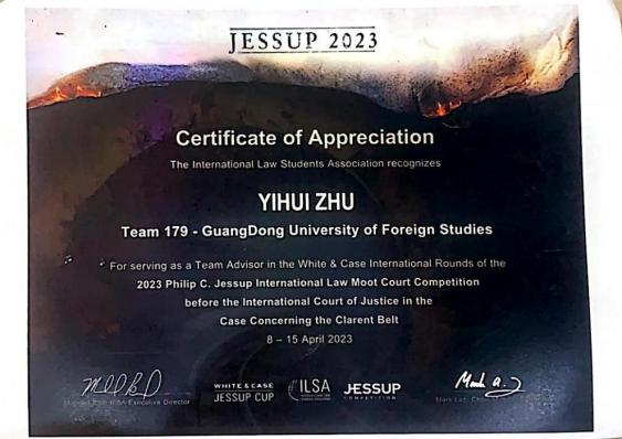 参加第二十一届“杰赛普”(JESSUP)国际法模拟法庭比赛中国赛区选拔赛获得一等奖并晋级国际赛,前往美国华盛顿特区参加第六十四届Philip C. Jessup国际法模拟法庭竞赛国际总决赛。