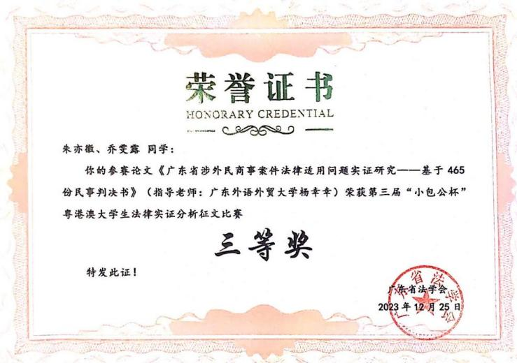 第三届“小包公杯”粤港澳大学生法律实证分析征文比赛三等奖。