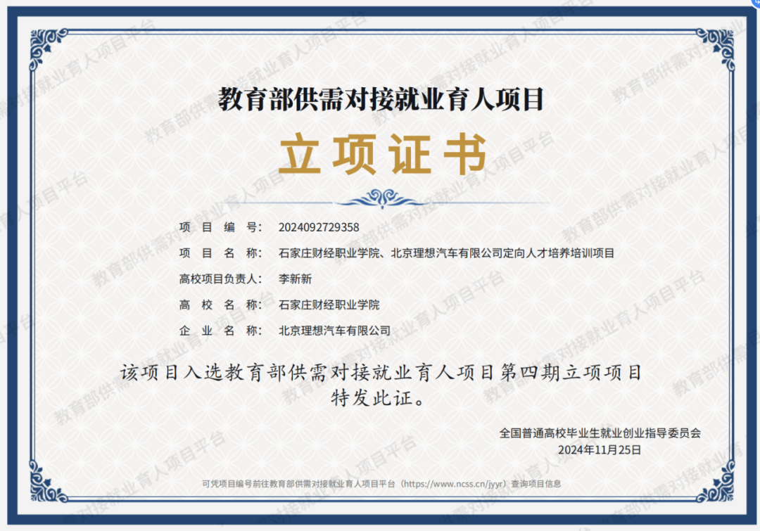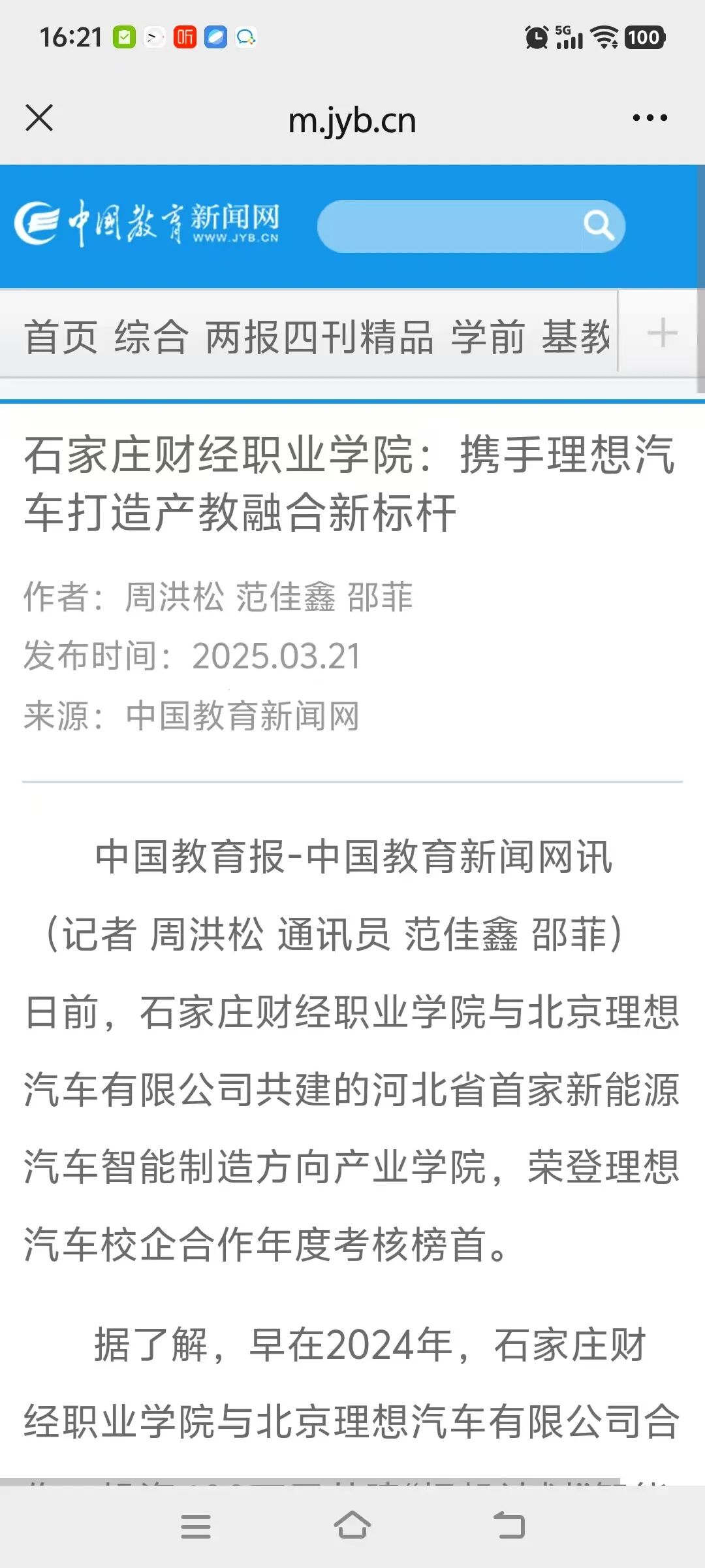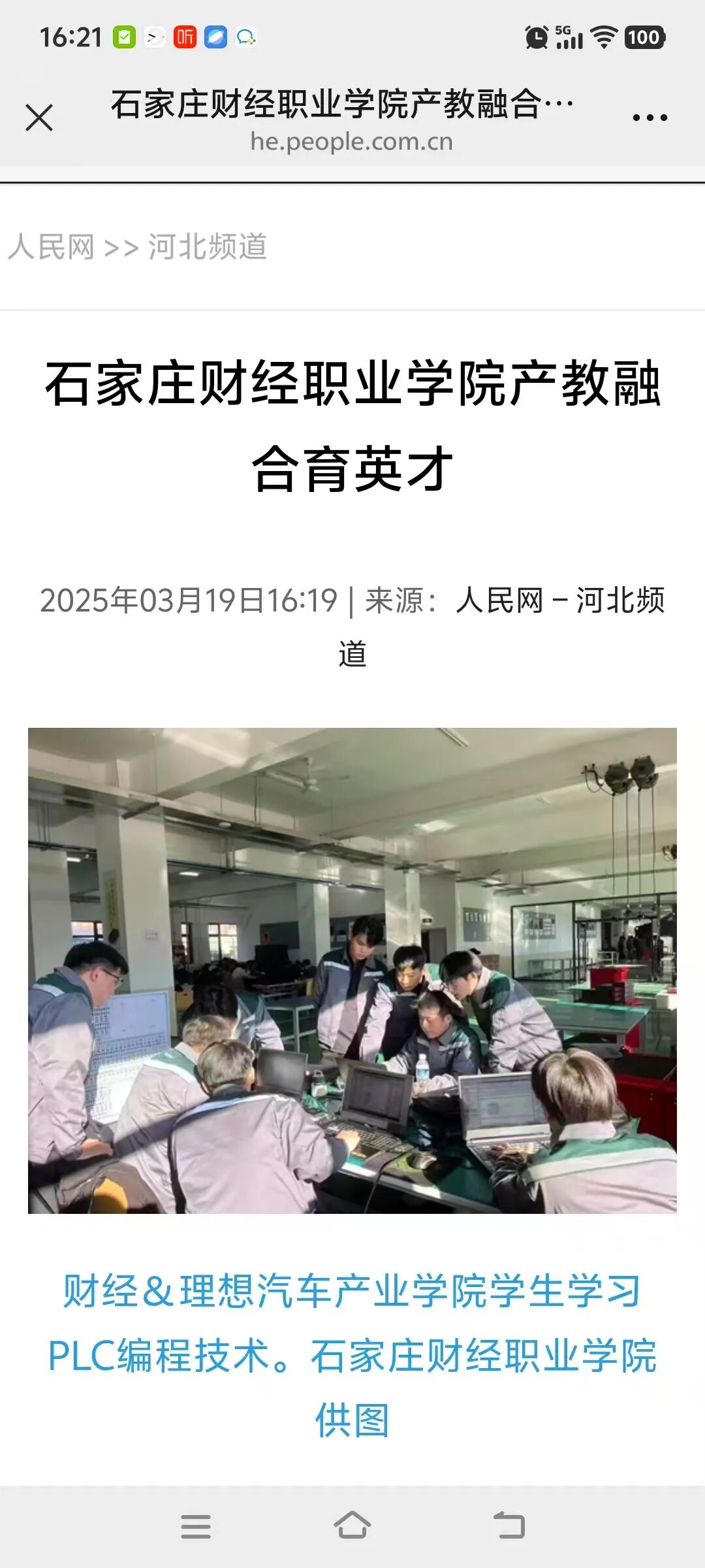 近期,我校在产教融合领域成果显著,备受媒体关注。人民网河北频道以《石家庄财经职业学院产教融合育英才》为题,深度聚焦财经&理想汽车产业学院实训场景,镜头里学生们正在学习 PLC 编程技术 ,生动展现了"课堂即车间、作品即产品"的沉浸式教学模式。中国教育新闻网报道了学院与北京理想汽车有限公司共建省内首家新能源汽车智能制造方向产业学院,且荣登理想汽车校企合作年度考核榜首。此项目于2024 年开展,如今取得的成绩彰显了学院在产教融合上的深度探索与卓越成效,为职业教育与产业发展的紧密结合树立了榜样。