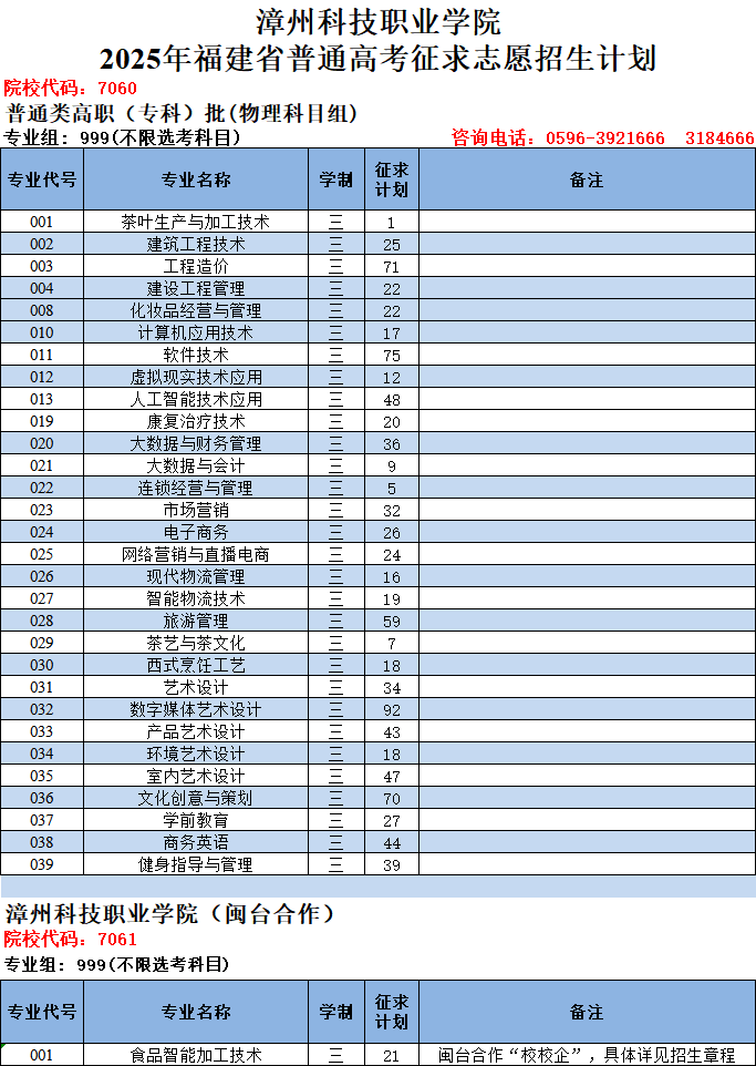 【普通高考】2025年漳州科技职业学院福建省普通高考普通类物理组第二次征求计划