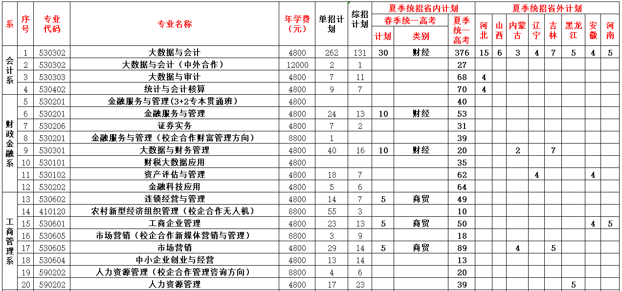 山东经贸职业学院2021年分专业招生计划一览表