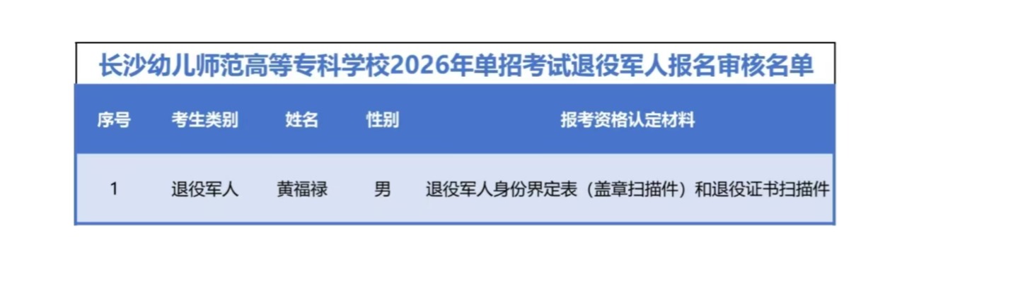 根据《长沙幼儿师范高等专科学校2026年高职单招章程》,单独招生工作领导小组对有关考生考生进行资格审查,现将审核结果为合格的考生名单予以公布。公示期:2月5日-2月10日。