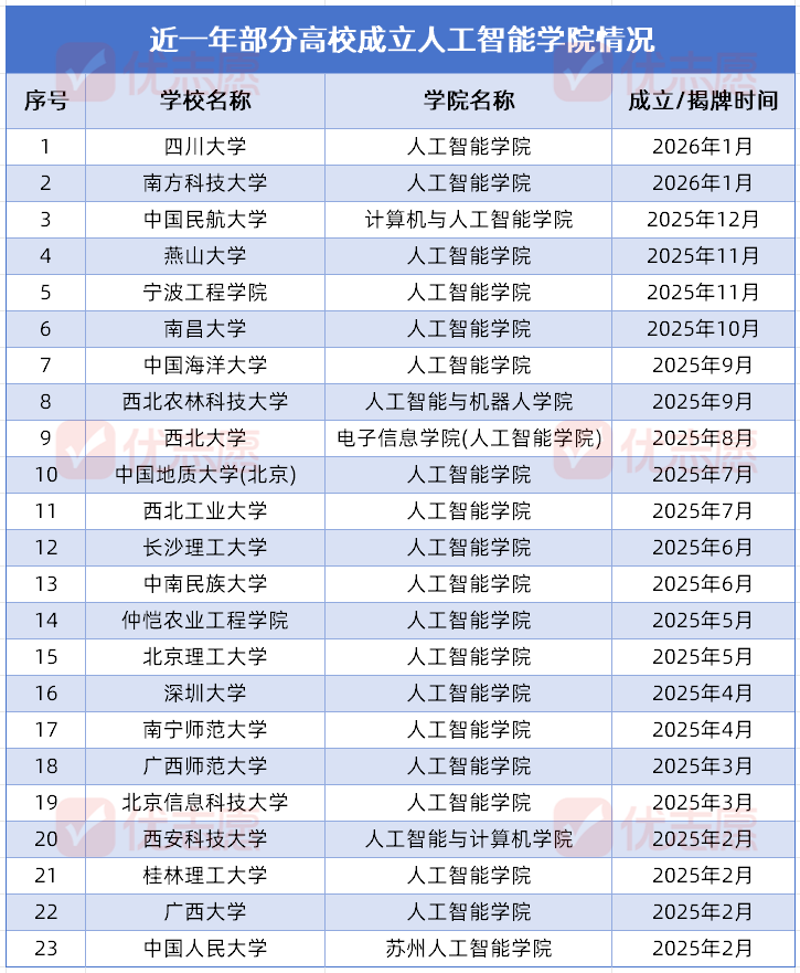 从国家战略层面来看,2025年8月,国务院发布“人工智能+”行动,明确到2027年,率先实现人工智能与6大重点领域广泛深度融合。同时,“十五五规划”也将人工智能列为重点发展方向,国家发展人工智能,最核心的短板是专业人才,而高校作为人才培养的核心阵地,成立专门的人工智能学院,正是为了培养符合国家需求的AI专业人才。