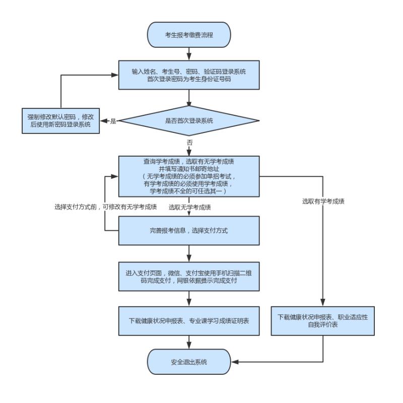 (4)考生没有语文、数学学考成绩的,录取类别须选择“无学考成绩”,需参加单招考试。选择后进入缴费页面,确定支付方式(支付方式确定后将无法修改有无学考成绩等报考信息)。考生选择微信或支付宝支付的,扫描二维码完成支付;选择网银支付的,根据网页提示完成支付。支付完成后,下载健康状况申报表(附件4)、专业课学习证明表,下载完毕后点击“退出”按钮安全退出系统。