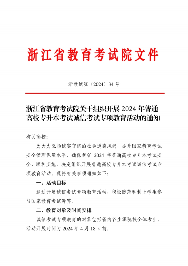 浙江省教育考试院关于组织开展 2024 年普通 高校专升本考试诚信考试专项教育活动的通知