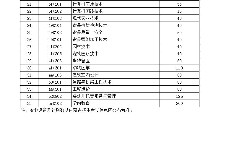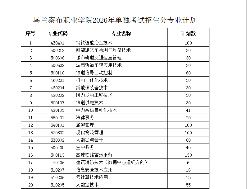 乌兰察布职业学院2026年单独考试招生分专业计划数