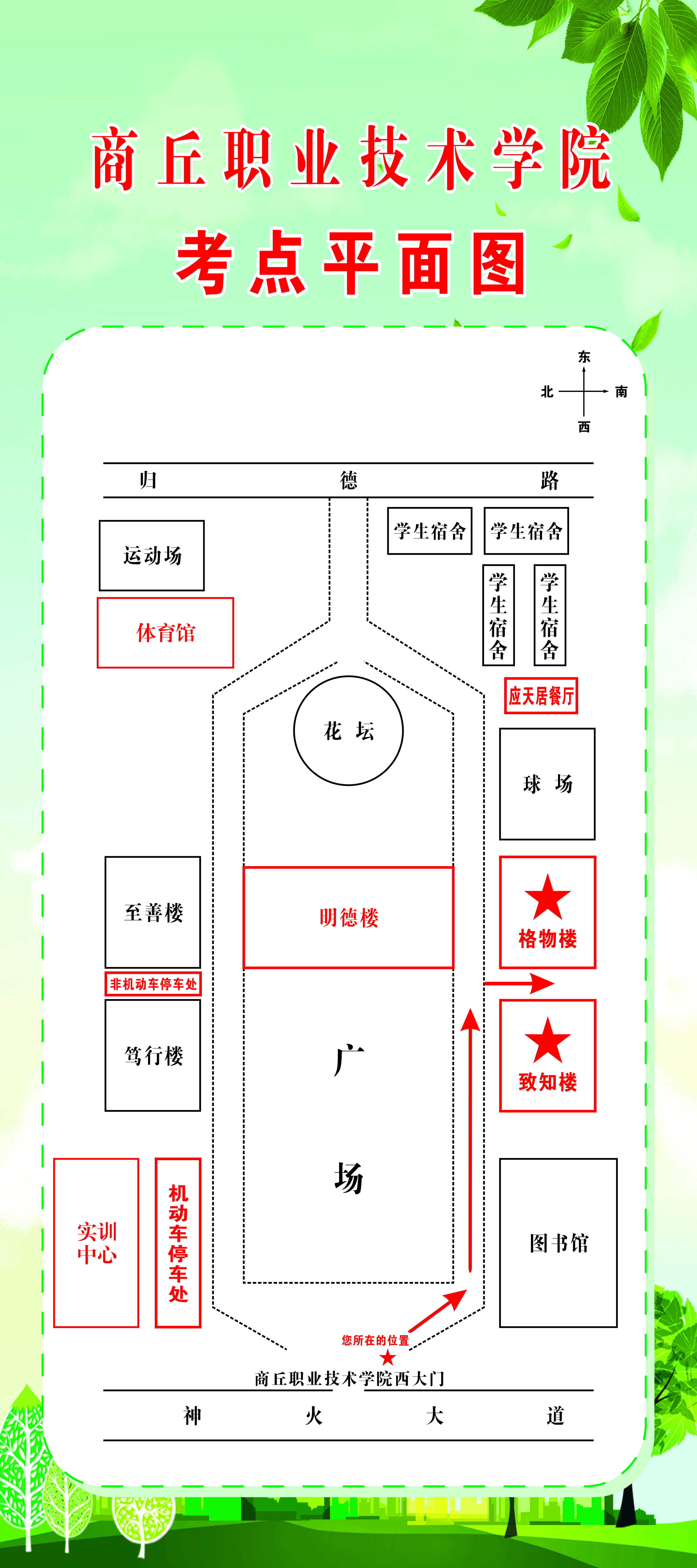 4月21日下午16:00—17:00可由我校西门进入学校,提前查看考区位置。其他非考试时间,考生不得进入考区。