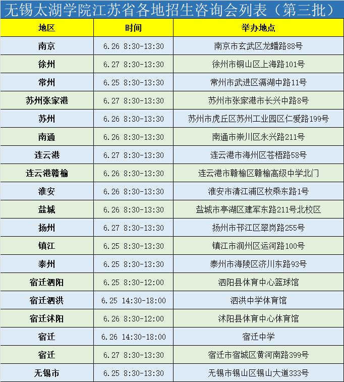 无锡太湖学院江苏省各地招生咨询会列表(第三批)