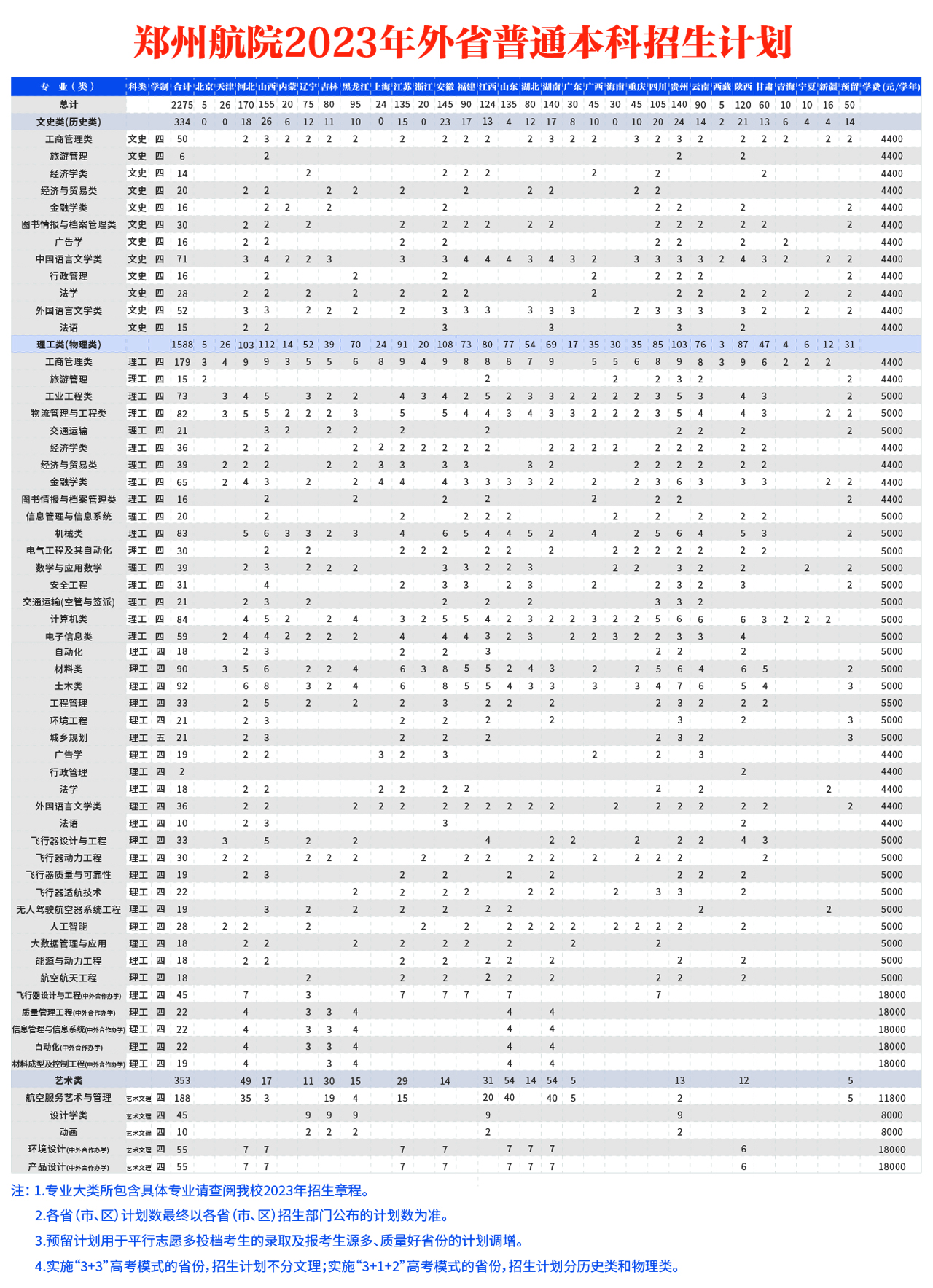 郑州航院2023年外省普通本科招生计划