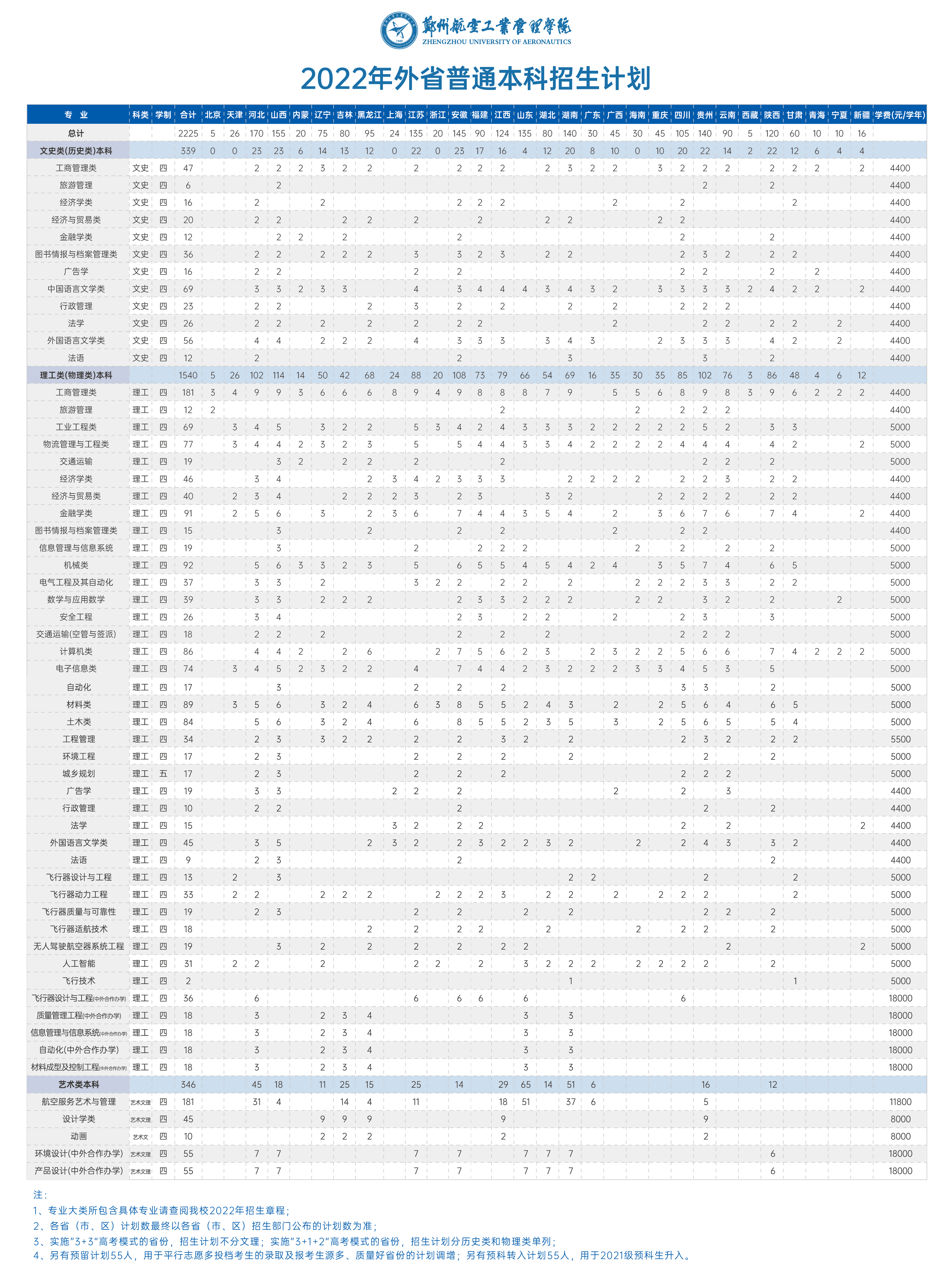 郑州航院2022年外省普通本科招生计划