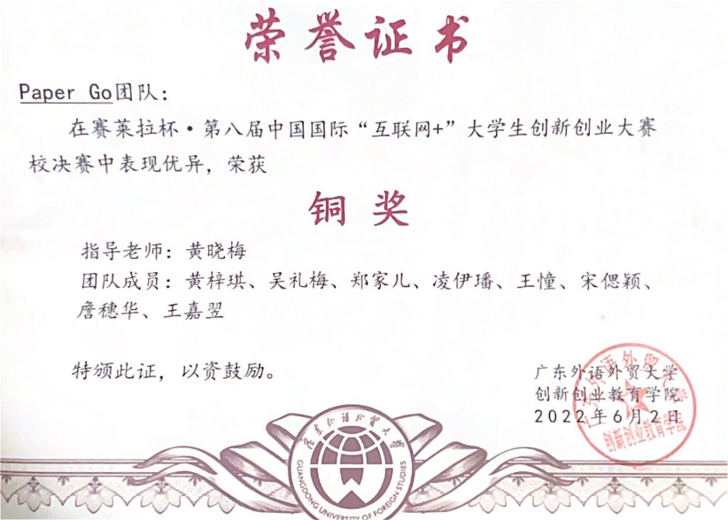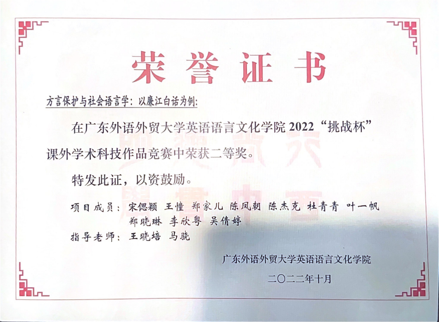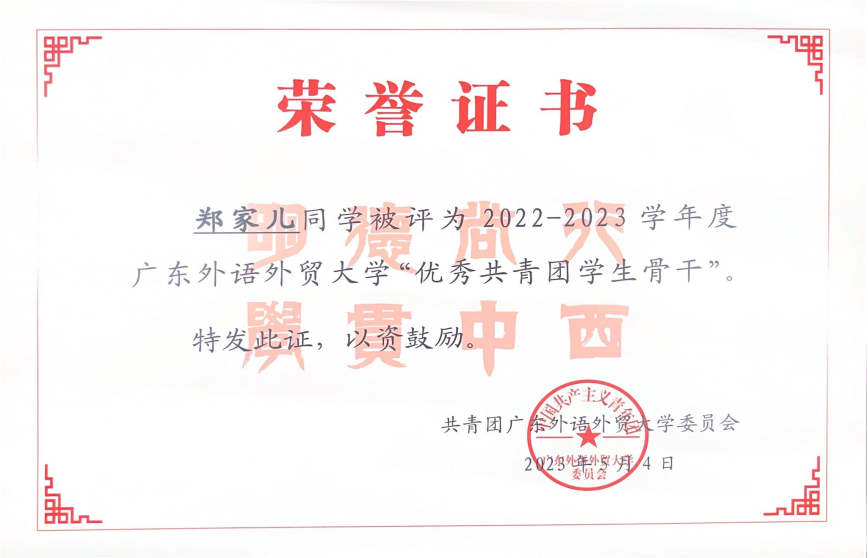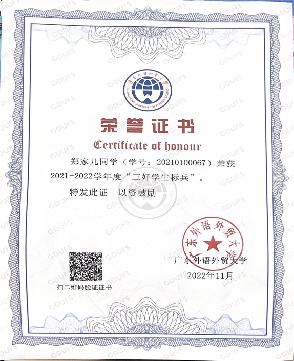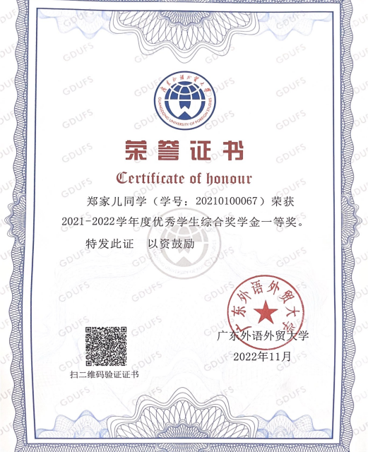 获奖情况:获广东外语外贸大学英文学院 “优秀学士” 荣誉称号、荣获广东外语外贸大学本科生优秀毕业论文(设计)、优秀学生综合奖学金一等奖、“三好学生标兵”、“优秀共青团学生骨干”等荣誉称号。