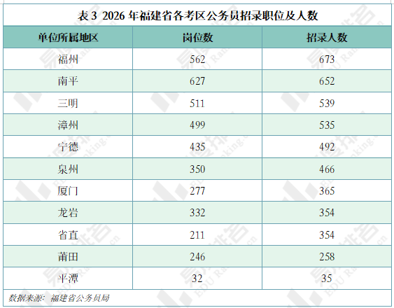 2026年福建公务员招录各地区中福州市计划招录人数最多,达到673人;南平市招录岗位最多,达到627个。
