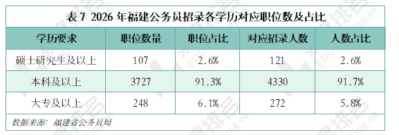 2026年福建省公务员招录中,大专学历仅可报考6.1%的岗位,本科学历可报考97.4%的岗位,研究生学历则可报考所有岗位。