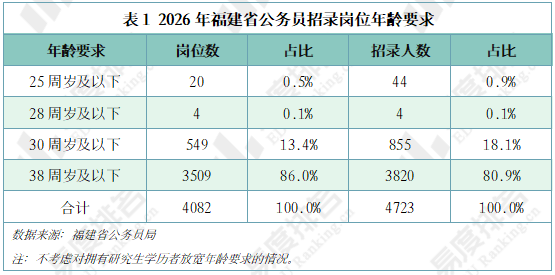 2026年福建省公务员招录共发布4082个岗位,计划招收4723人。福建省公务员报考年龄要求为18周岁以上、38周岁以下(在1987年1月至2008年1月期间出生)。对于2026届研究生,报考年龄条件为38周岁以下应届生岗位的,放宽到43周岁以下(1982年1月以后出生),报考年龄条件为30周岁以下的人民警察应届生岗位的,放宽到35周岁以下(1990年1月以后出生)。