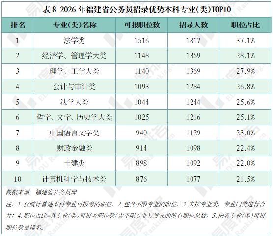 2026年福建省公务员招录本科生可报考的岗位中,有732个岗位无专业限制。法学类专业本科生可报考岗位占比达37.1%,大幅领先其余本科专业(大类)。可报职位数前十的专业(类)中,仅有理工大类、土建类、计算机科学与技术类3个理工类专业,法学、经济学、管理学等文科门类的毕业生考公更具优势。