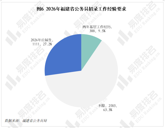 2026年福建省公务员招录中63.3%的岗位不限制报考人员工作履历,27.2%的岗位明确面向应届高校毕业生,9.5%的岗位要求两年基层工作经历。应届高校毕业生可报考90.5%的岗位,考公优势最明显。