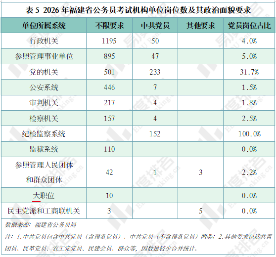 下表展示了2026年福建省公务员系统单位招录岗位对政治面貌的要求情况。其中纪检监察系统仅限中共党员报考,党的机关单位31.7%的岗位限中共党员报考。其他系统的岗位对政治面貌要求较为宽松。