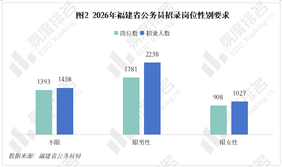 福建省公务员招录岗位对性别限制较为明确,34.13%的岗位对性别无要求,43.63%的岗位限男性报考,22.24%的岗位限女性报考。