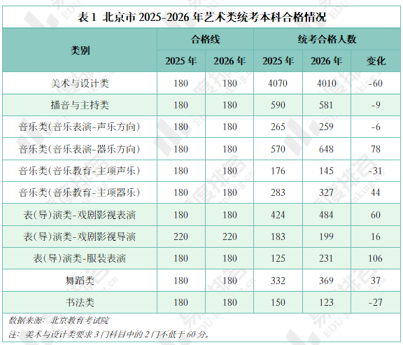 北京市2026年艺术统考各类别合格线与2025年一致。表(导)演类