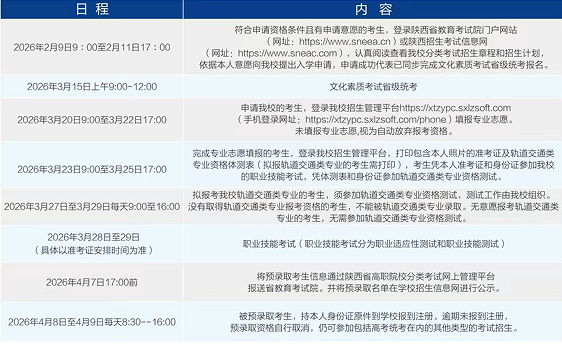 (3)完成专业志愿填报的考生,于2026年3月23日9:00至3月25日17:00登录我校招生管理平台,打印包含本人照片的准考证及轨道交通类专业资格体测表(拟报轨道交通类专业的考生需打印),考生凭本人准考证和身份证参加我校的职业技能考试,凭体测表和身份证参加轨道交通类专业资格测试。