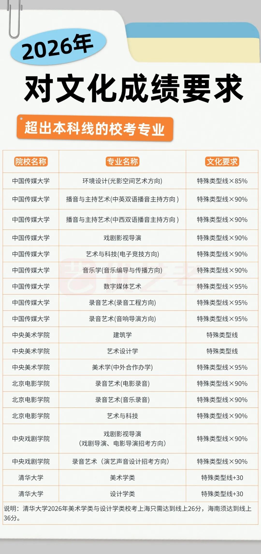 大家都知道,按照教育部的基本要求,校考专业的文化课成绩,至少要达到本省普通类专业相应批次的录取控制分数线,也就是我们常说的本科线,但也有不少顶尖院校的校考专业,文化分要求其实远高于普通本科线,