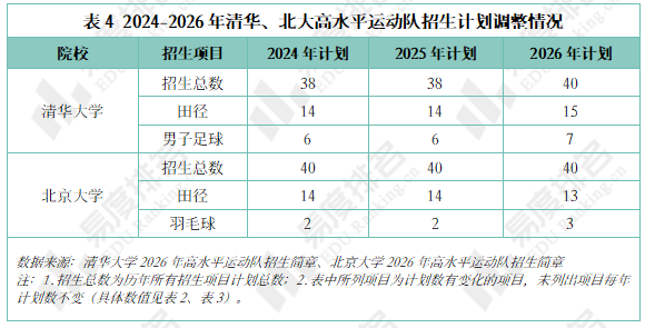 近三年招生数据显示,清华大学高水平运动队计划上限较2024年增加2人,北京大学则保持不变。具体项目调整方面,清华大学田径项目、男子足球项目2026年各增加1人;北京大学田径项目2026年减少1人,羽毛球项目2026年增加1人。