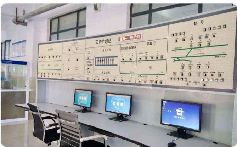 城轨实训室通过1:1等比例还原真实地铁站、列车驾驶舱、车厢内部等场景为学生提供逼真的实训环境。高铁舱配备全套模拟设备,包括车头驾驶舱、一等座和二等座座位区、行李架和播音区等,驾驶舱内部一比一还原设计,依托先进完善的实训设备,助力学生成长成才。