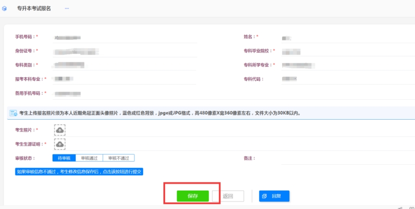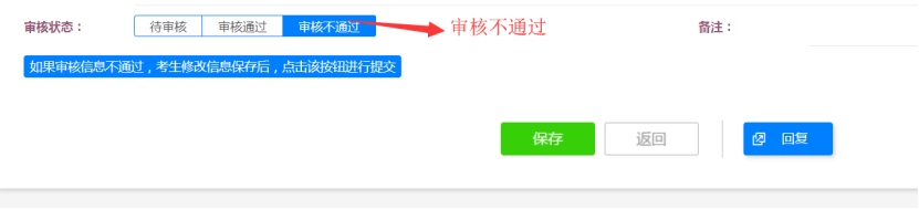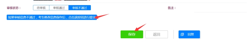 考生需及时登录报名系统查看审核状态;若审核不通过,须及时登录系统修改相关信息,修改完成后先点击“保存”,再点击“如果审核不通过,考生修改信息保存后,点击该按钮进行提交”,此步骤为必操作,否则报名信息无法恢复至待审核状态。