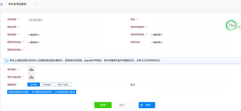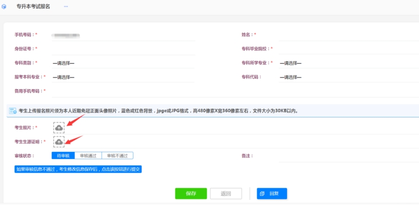 2.报名页面包含考生姓名、身份证号、专科毕业院校、专科毕业专业、报考专业、备用手机号等字段,均是必填字段,考生务必保证所填写内容真实、准确,若存在信息填报不全不实、弄虚作假,导致不能通过报名审核,无法打印准考证,无法正常参加后续考试的,由考生本人承担责任。