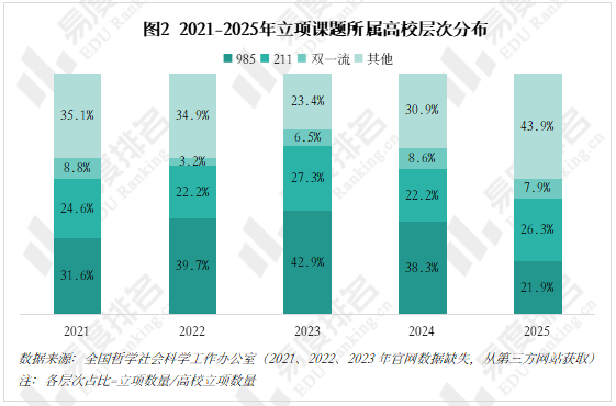入选课题的责任单位中,高校占比从2021年的80.28%升至2025年的87.69%,是冷门绝学研究领域的主导力量。