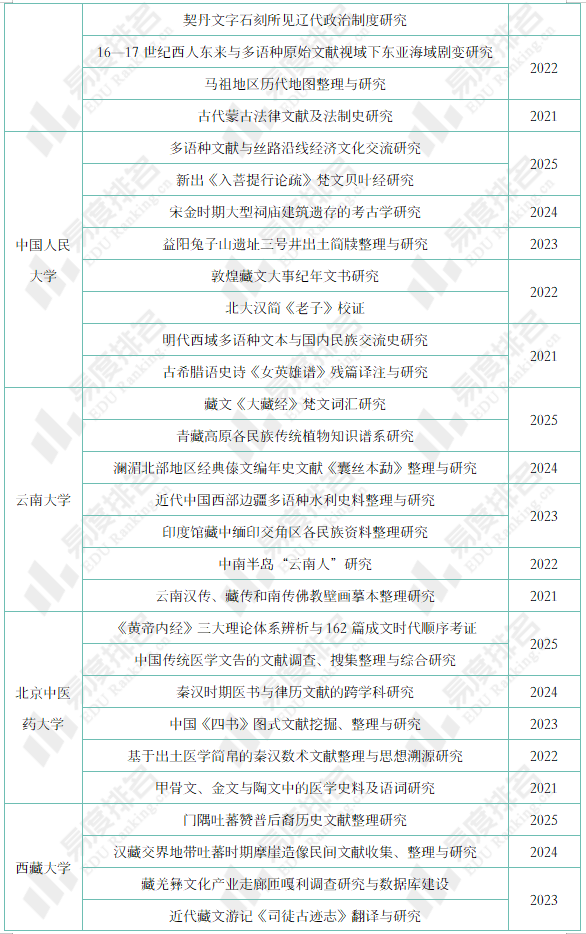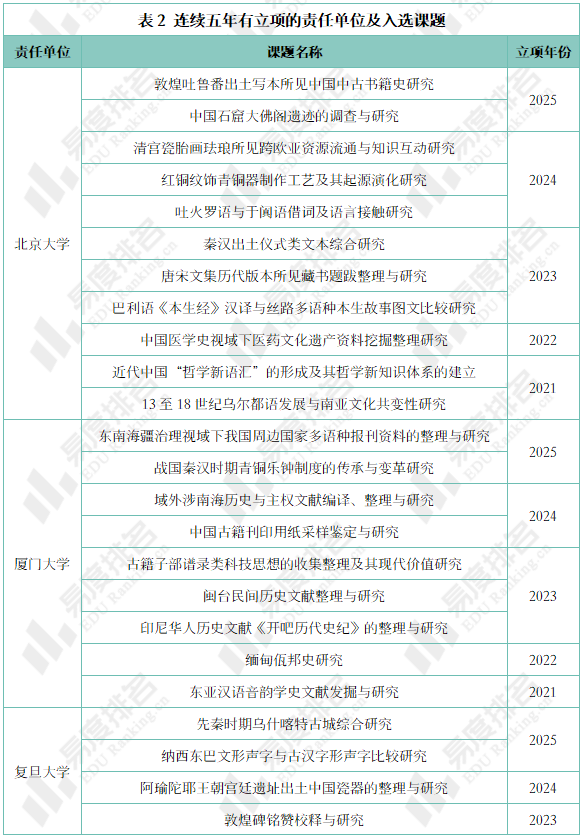 八所责任单位连续五年有项目上榜,包括北京大学、厦门大学、复旦大学、中国人民大学、云南大学、北京中医药大学、西藏大学和中山大学。其中,北京大学、厦门大学、复旦大学、中国人民大学等高校依托雄厚的人才资源和科研实力,入选课题范围拥有极高的广度;云南大学、西藏大学立足本地深厚的历史文化底蕴,在少数民族文化研究领域贡献显著;北京中医药大学则聚焦学科特色,在中医药历史文化研究领域持续输出科研成果。