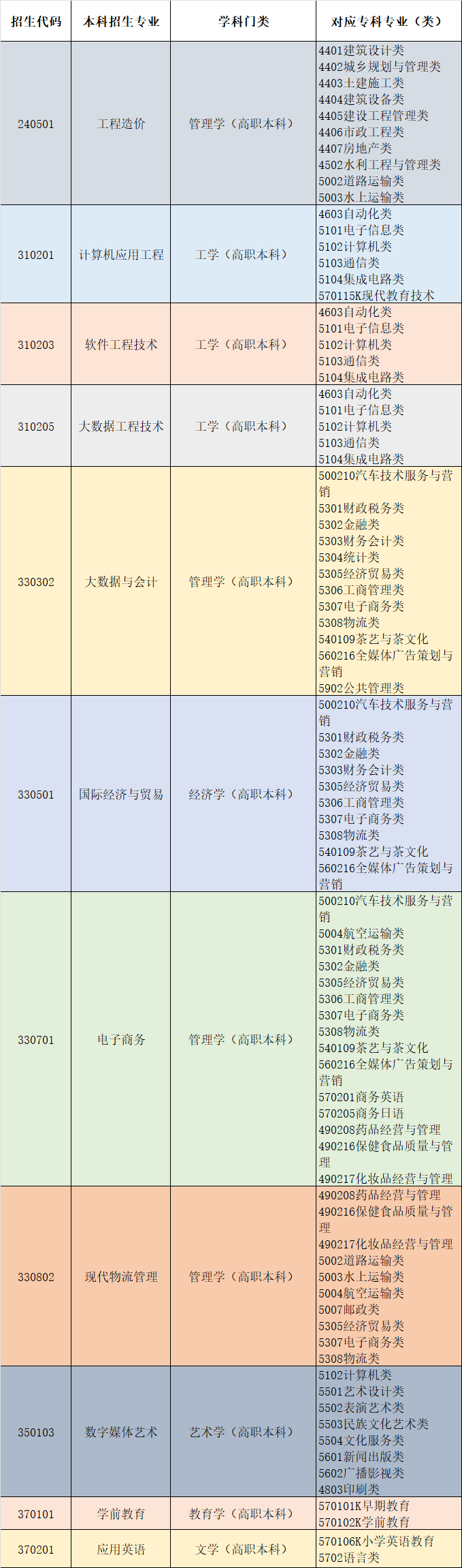我校专升本专业对应专科类别