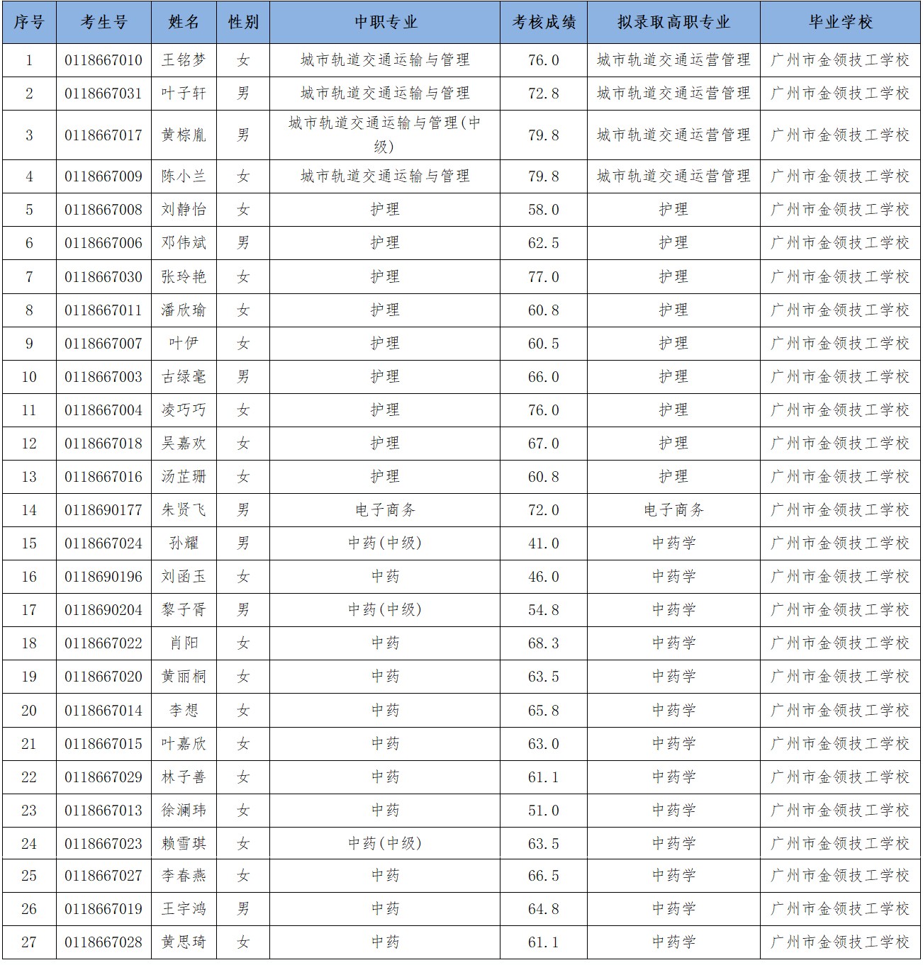 根据《关于做好2026年职业院校中高职贯通培养三二分段高考报名及录取审核工作的通知》(粤招办【2025】9号)及《广东省教育厅 广东省招生委员会办公室关于做好2025年中高职贯通培养三二分段转段考核工作的通知》(粤教职函〔2025〕9号)的要求、《广州华南商贸职业学院2026年中高职贯通培养三二分段招生章程》和《广州华南商贸职业学院2025年中高职三二分段培养转段考核工作实施方案》等文件精神,现将2026年三二分段转段对各专业拟录取最低控制分数线以及拟录取名单进行公示,公示期过后将根据招生章程开展考生录取资格审核工作,正式录取名单以省考试院审核通过的名单为准。