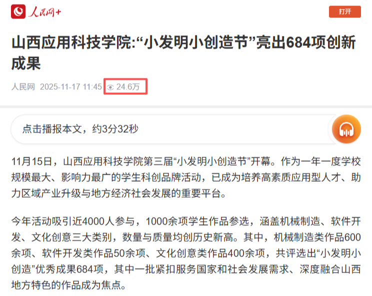重大活动宣传实现突破。建校34周年活动构建多平台宣传矩阵,相关报道登上人民网,开创对外宣传新成果;小发明小创造节整合校内外近20家主流媒体报道,新华网客户端传播量超100万+、人民网达40万+,宣传成效斐然。
