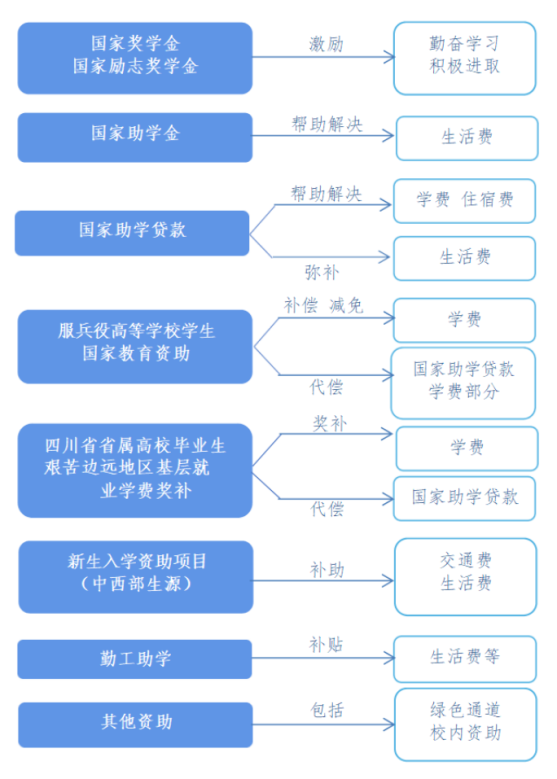 在高等教育本专科阶段,目前已建立起国家奖学金、国家励志奖学金、国家助学金、国家助学贷款等多种形式有机结合的资助政策体系。如遇国家政策调整,以新政策文件为准。