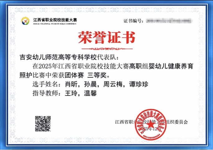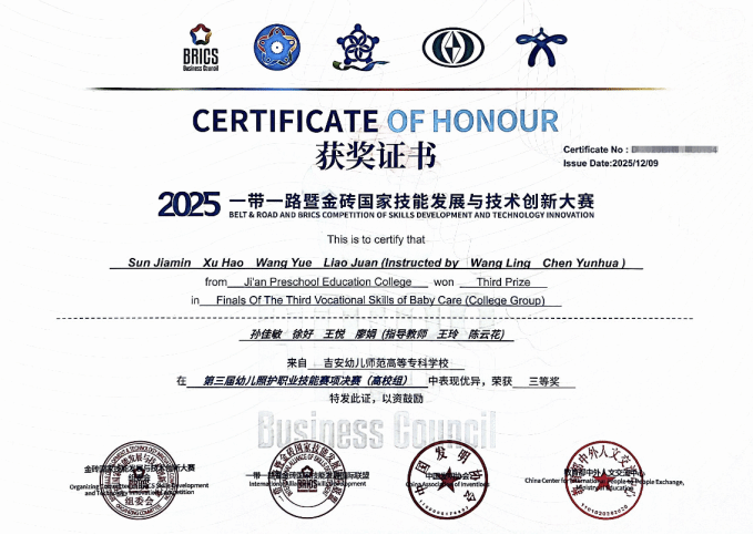 3.突出竞赛成绩:师生在 “一带一路暨金砖国家技能发展与技术创新大赛”、“江西省职业院校技能大赛” 等国家级、省级权威赛事中屡获大奖,在婴儿回应性照护、幼儿照护等赛项中多次斩获二、三等奖,证明了我们卓越的人才培养实力。