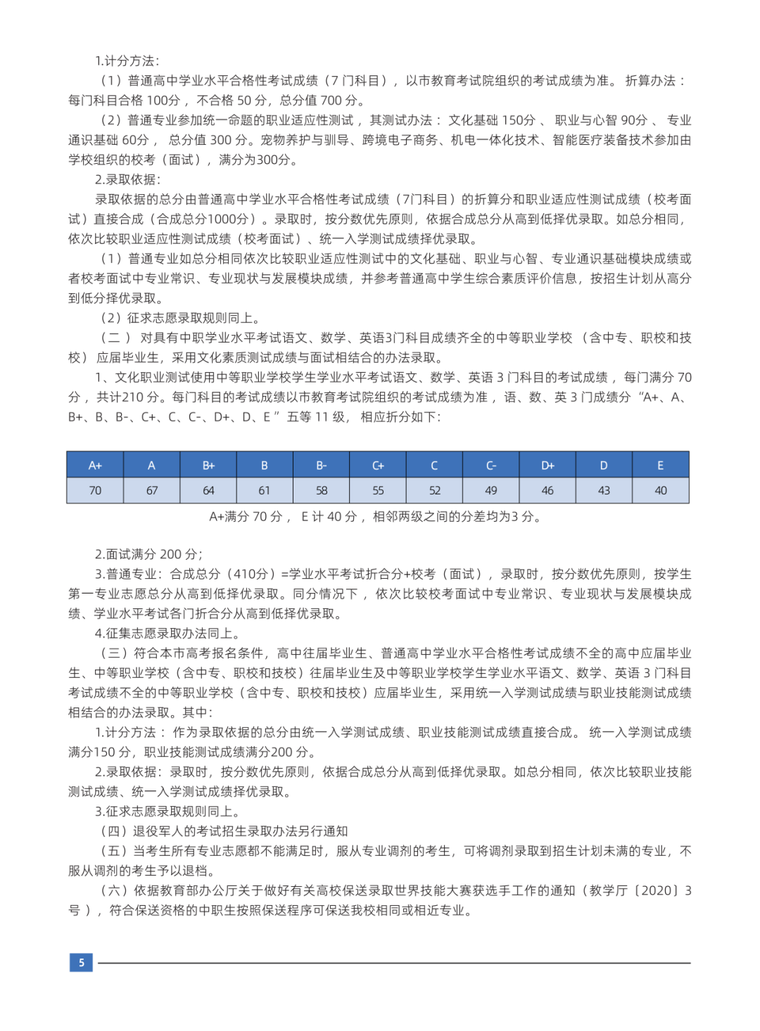 2.录取依据:录取依据的总分由普通高中学业水平合格性考试成绩(7门科目)的折算分和职业适应性测试成绩(校考面试)直接合成(合成总分1000分)。录取时,按分数优先原则,依据合成总分从高到低择优录取。如总分相同,依次比较职业适应性测试成绩(校考面试)、统一入学测试成绩择优录取。